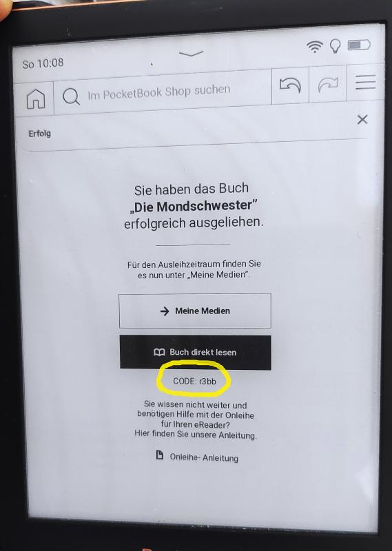 "Nach erfolgreicher Leihe erhalten Sie die Möglichkeit, das Buch direkt zu lesen. Darunter wird Ihnen ein kurzer Code-Schlüssel angezeigt, den Sie sich notieren sollten. Beim ersten Öffnen des ausgeliehenen Buchs müssen Sie diesen Code eingeben – anschließend merkt sich der E-Reader die Zugangsdaten und der Öffnungsvorgang passiert automatisch."(Tolino)